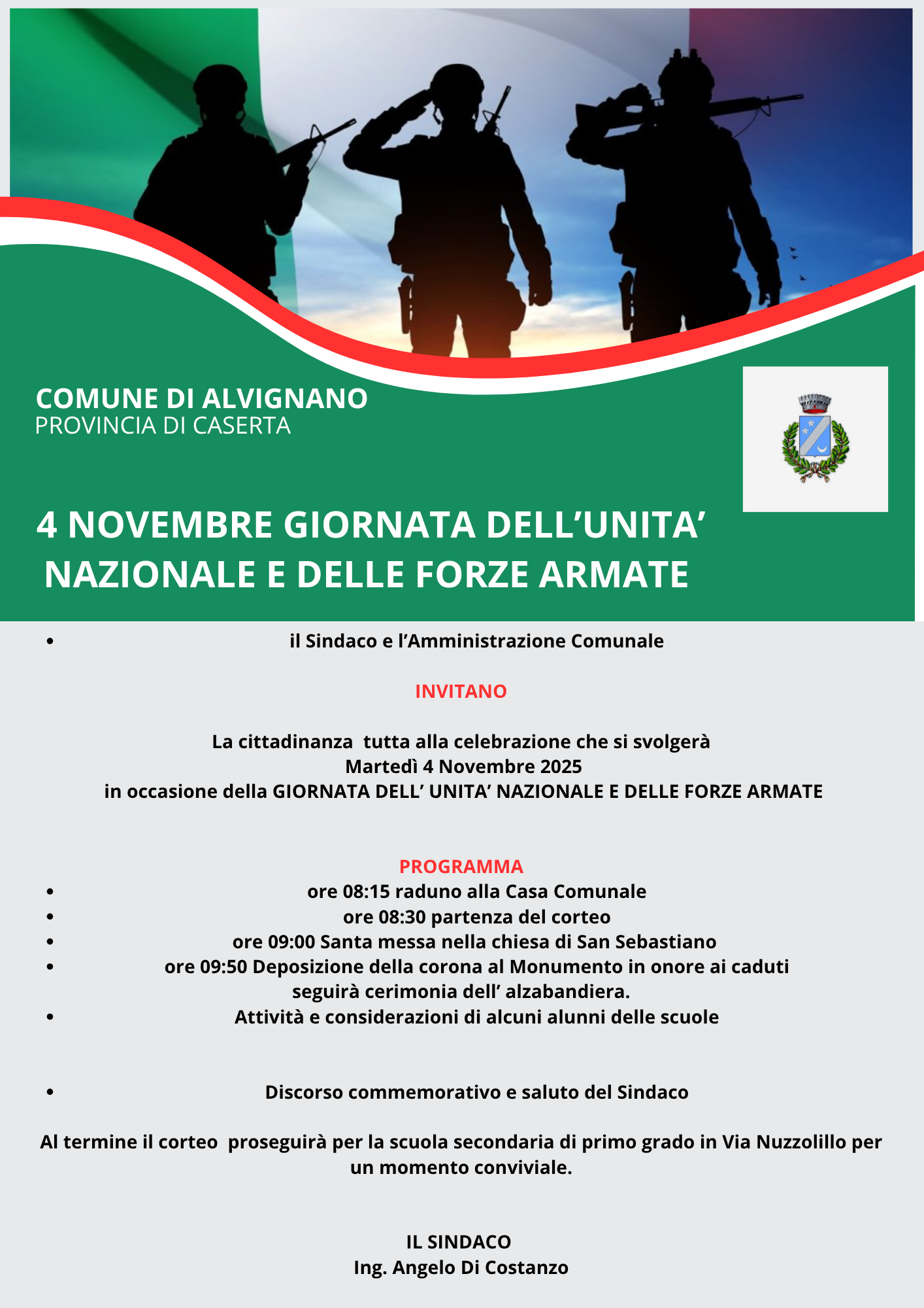 La cittadinanza tutta alla celebrazione che si svolgerà martedì 4 novembre 2025 in occasione della Giornata dell'Unità Nazionale e delle Forze Armate